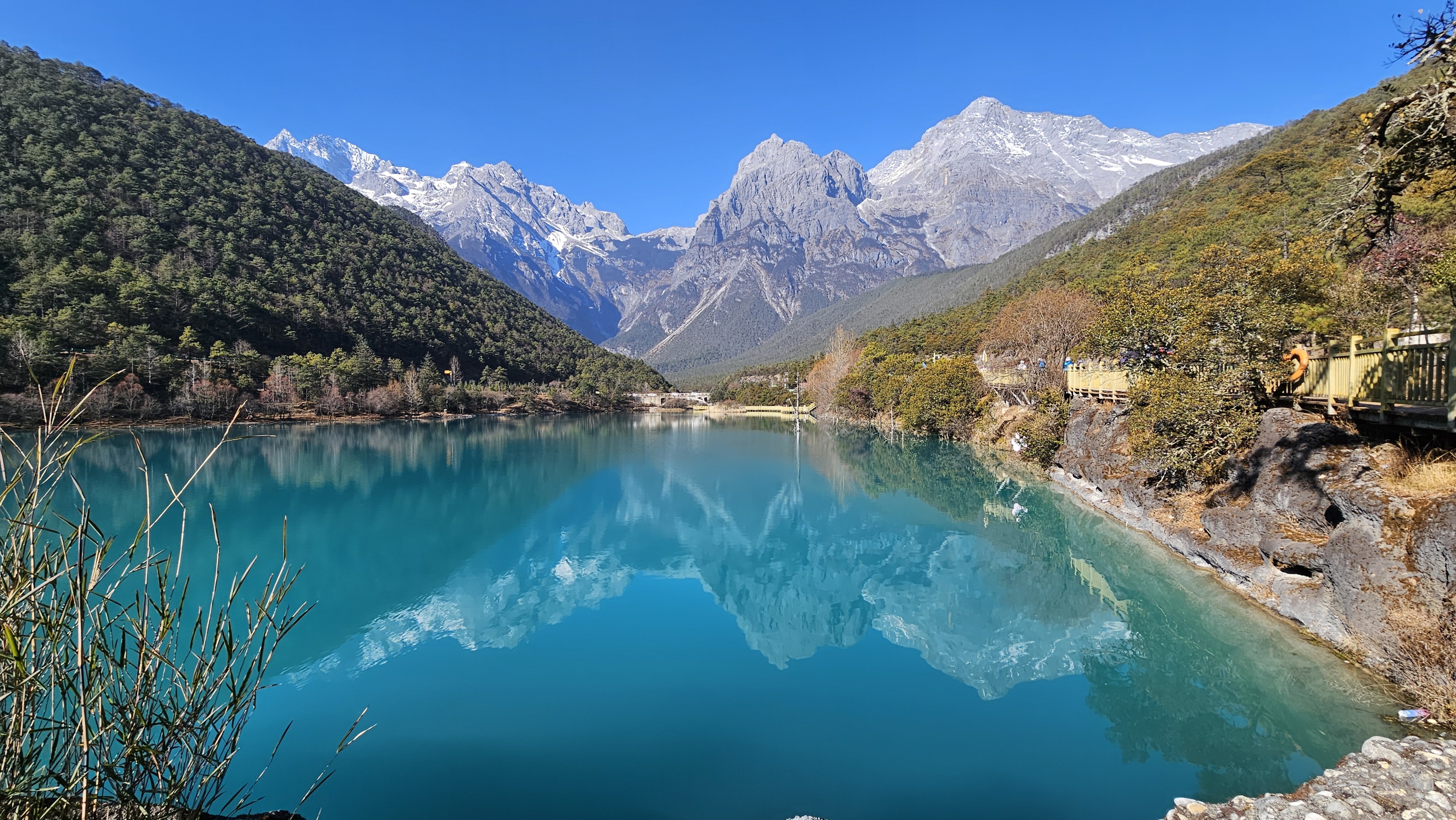 물빛에 홀려 잔도를 따라 걷다보면 중국인 개인방송인들이 촬영하는 것을 많이 볼 수 있다. 설산이 청록색 물에 비치는 풍경이 CG인 듯 비현실적인데 사람들이 너무 많아서 그 꿈이 얼른 깬다.