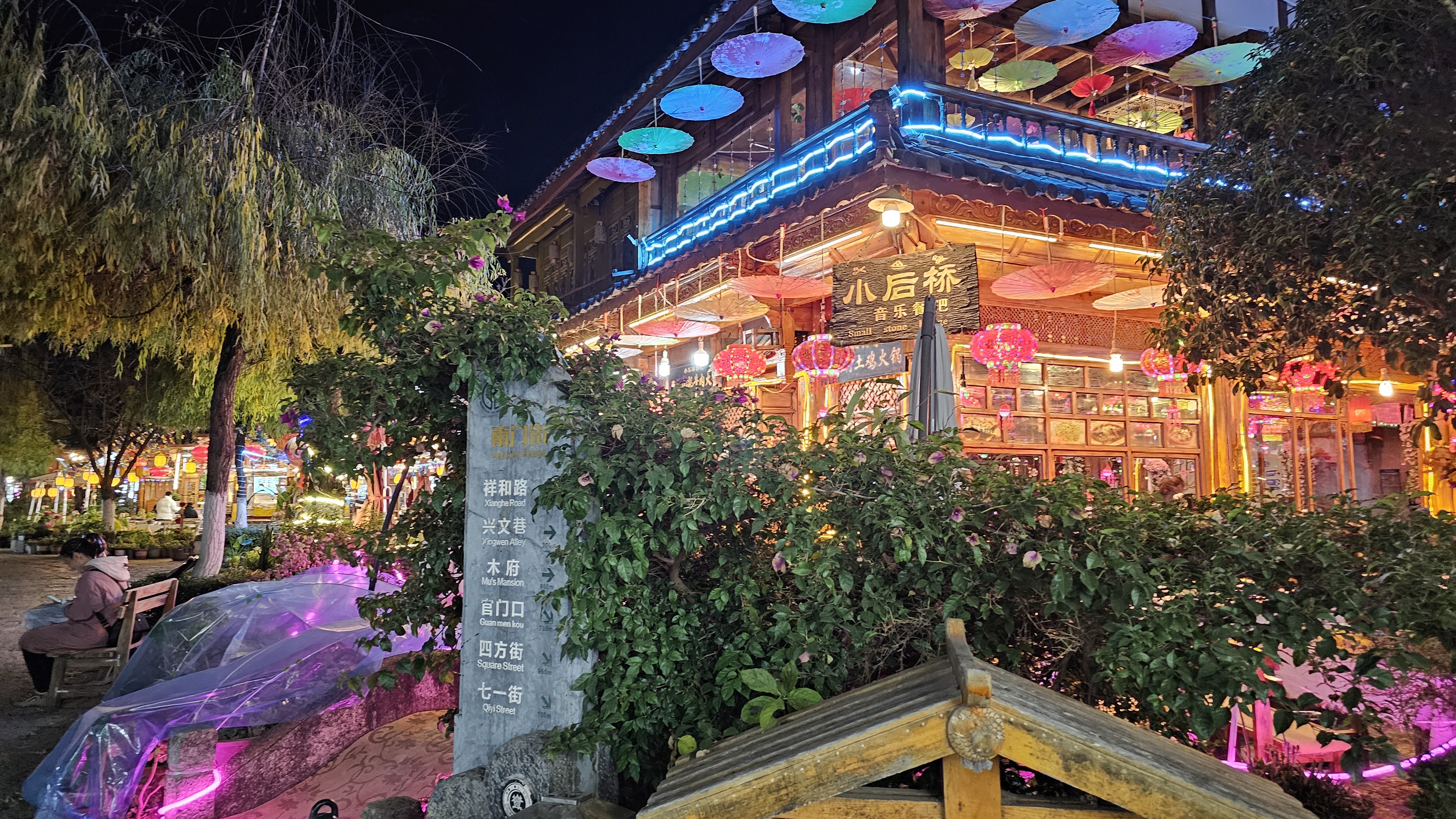목부의 건축은 ‘북자남목(北紫南木)’ 북쪽은 자금성, 남쪽은 목부라는 말이 있을 정도로 배치와 위계가 자금성을 닮아 중앙축을 기준으로 대문–의전 공간–후원이 일직선으로 배치되어 있다. 한족식 궁궐 구조 위에 나시족 특유의 목조 건축, 장식 문양, 자연 친화적 배치가 결합한 건물이다. 서재인 만권루에는 과거 수만 권의 책과 문서가 보관되어 있었는데 동파문자 관련 기록과 경전이 보관되어, 나시족의 종교·철학·역사 연구의 중요한 자료가 되었다 한다. 청나라 말기 이후 쇠퇴, 1996년 리장 대지진 이후, 전통 사료와 고증을 바탕으로 대규모 복원하여 현재는 박물관형 유적지로 공개하고 있다. 밤이라 안에는 들어가 보지 못하고 불 밝혀 놓은 문만 보고 나왔다. 낮에 고성을 돌아볼 기회가 없었던 것이 아쉬웠다.