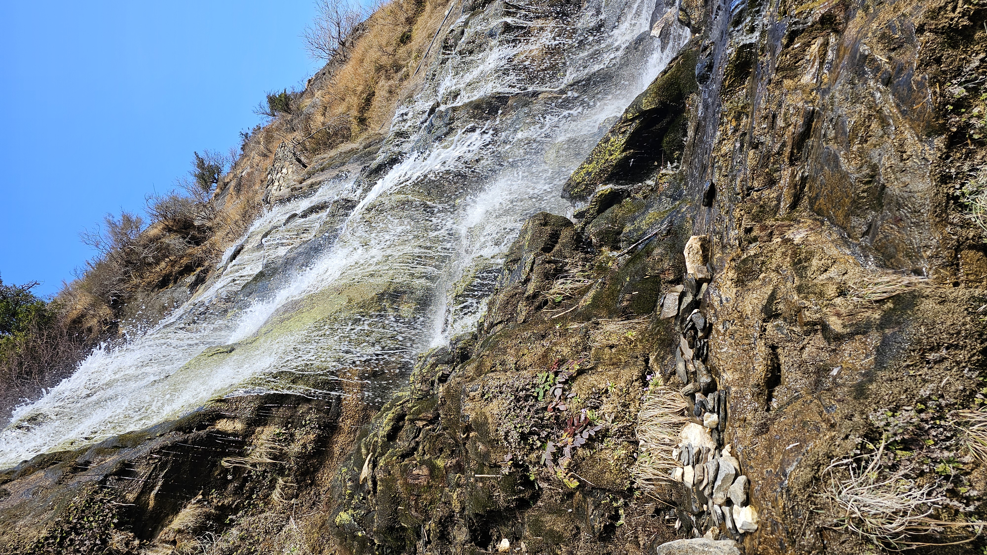 크게 오르막은 아니고 비교적 평탄한 길을 30분 정도 가니 저 멀리 관음보살의 하얀 치맛자락 같은 물줄기가 여러 갈래로 내려오고 있는 폭포가 보인다. 폭포 가까이 가니 봄꽃인 설앵초가 피어 있다. 물은 차갑고 맑다. 염소 한 마리가 지나가는 풍경이 고대에서 튀어나온 것 같다. 절벽에 복류되어 떨어지는 폭포를 보고는 중도객잔으로 되돌아왔다.
