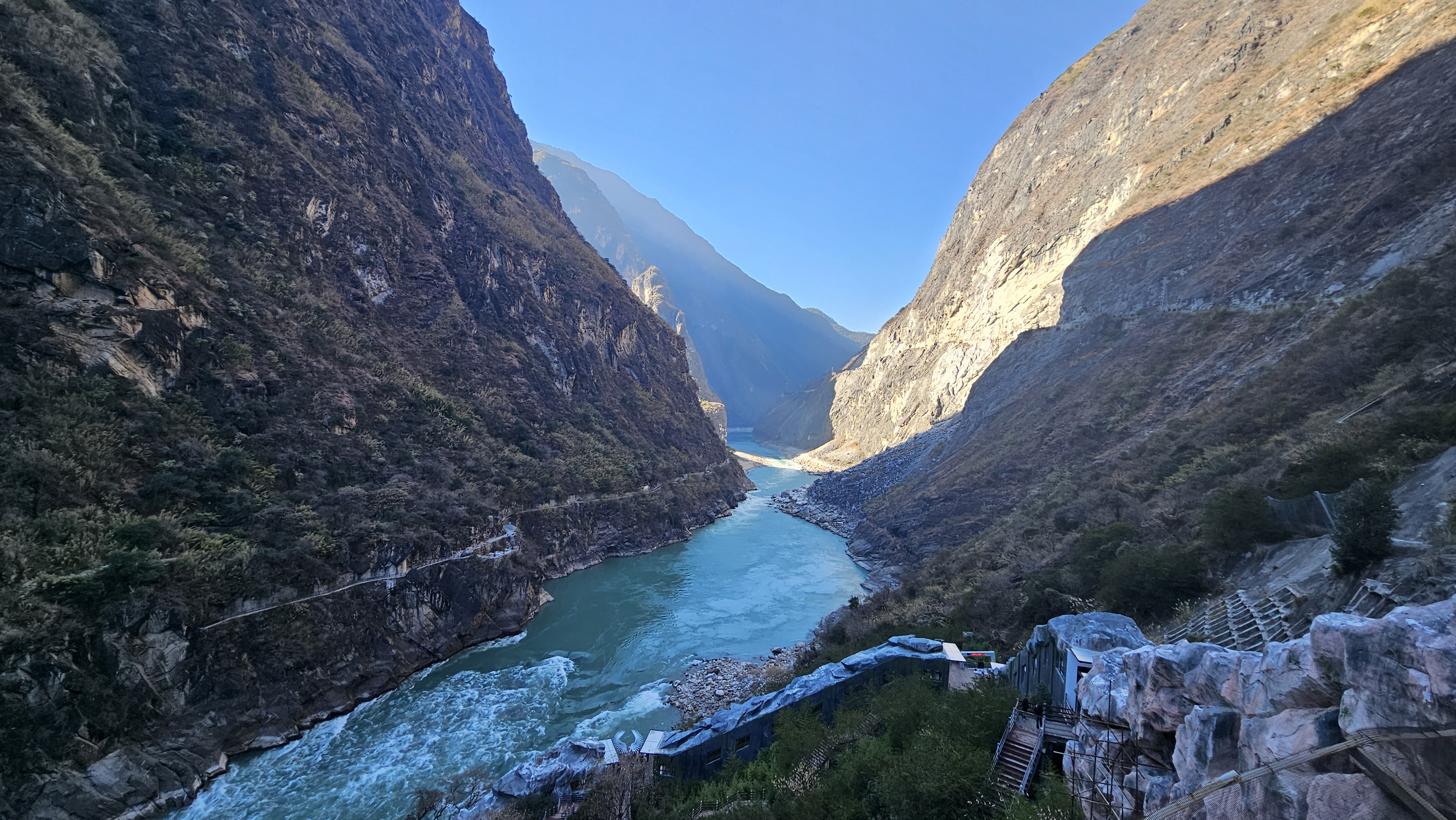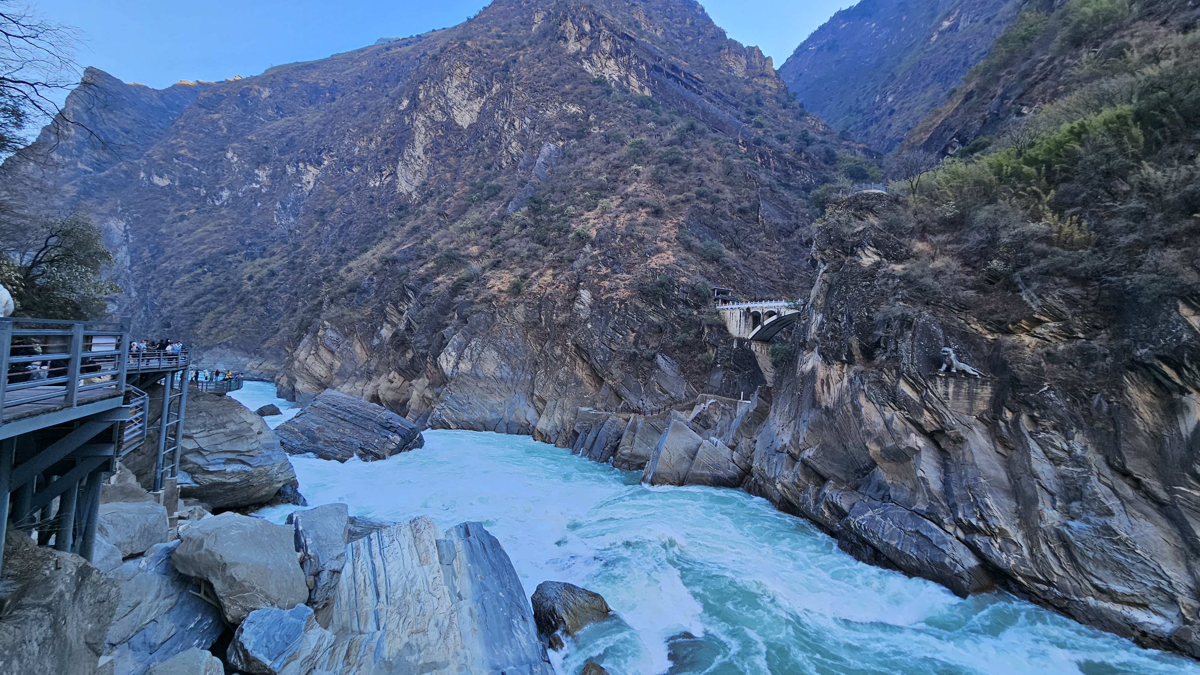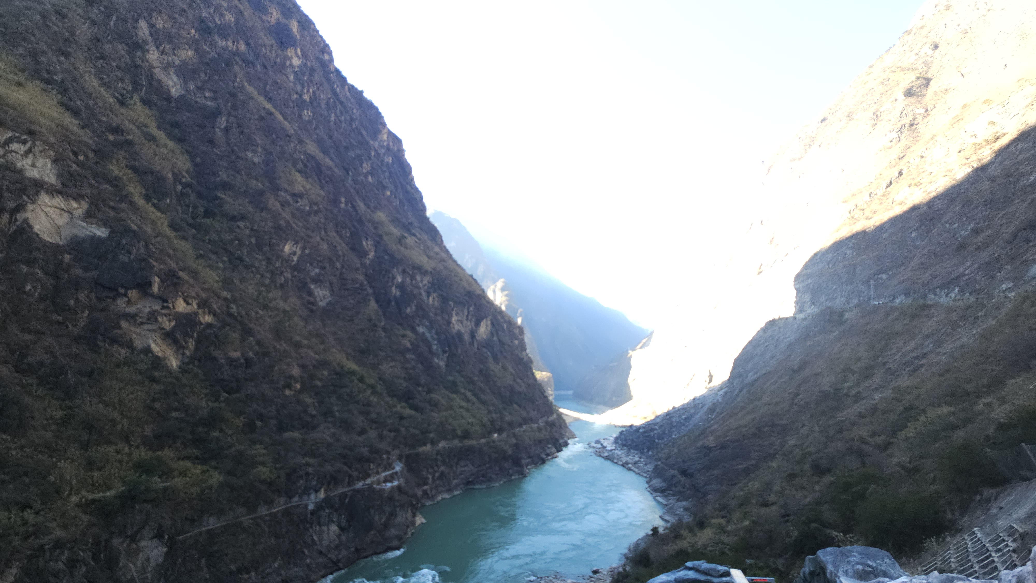 중간에 작고 소박한 휴게소에 들러 나가보니 날이 차갑다. 상호도협으로 가는 에스컬레이터를 타고 한참을 내려가니 협곡이 나온다. 호도협(虎跳峡, Hǔtiào Xiá)은 금사강이 옥룡설산(玉龙雪山)과 하바설산(哈巴雪山) 사이를 가르며 흐르는 구간의 협곡이다. “호랑이가 뛰어넘은 협곡”라는 뜻으로 협곡의 가장 좁은 곳의 폭이 약 30m 내외로, 전설에 따르면 호랑이가 강 위의 바위를 딛고 건넜다고 해서 붙은 이름이라고 한다. 전체 길이는 약 16km, 낙차 약 3,900m로 미국 그랜드캐니언, 페루 콜카 협곡과 함께 세계 3대 협곡 중 하나로 꼽힌다.