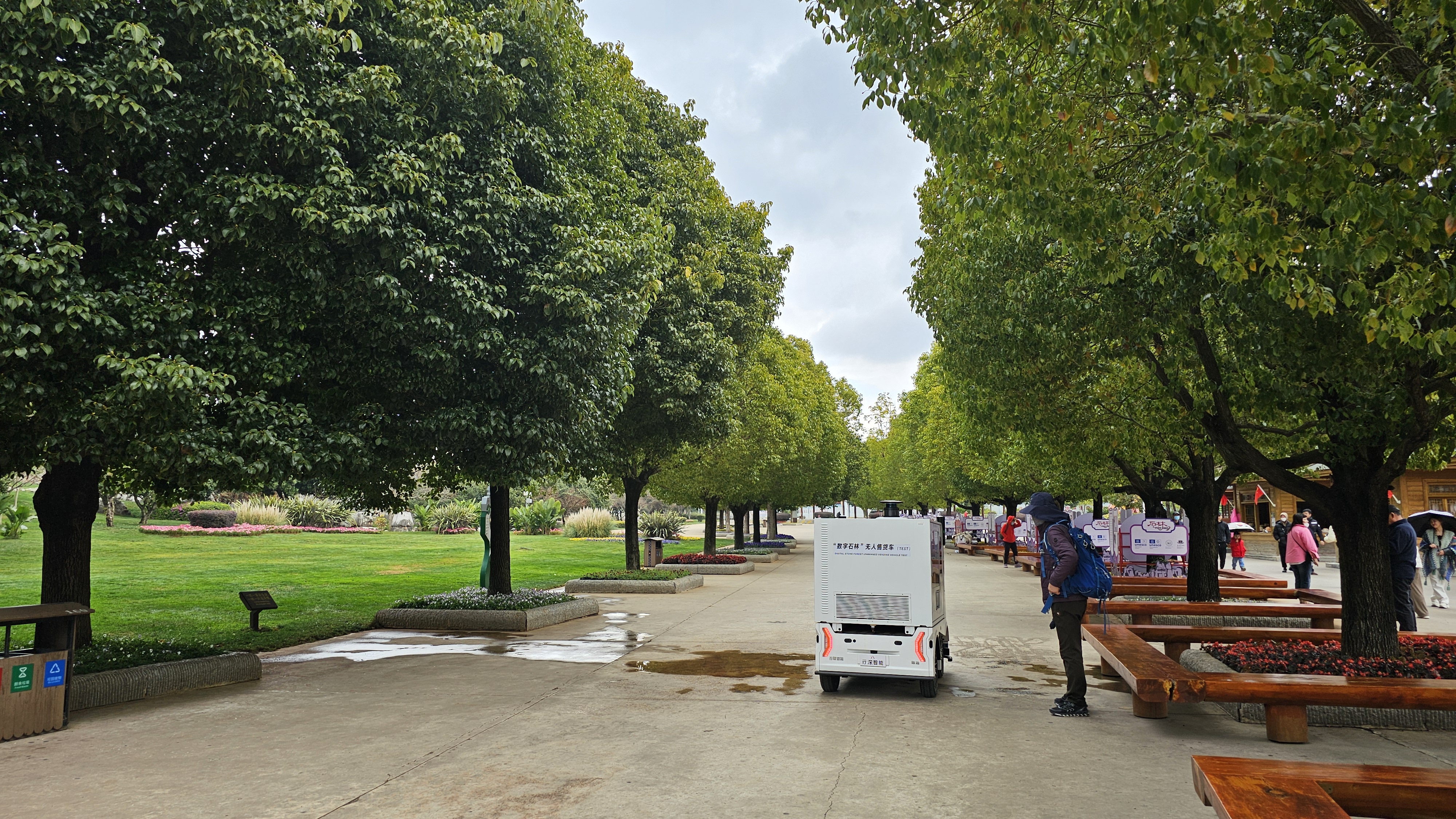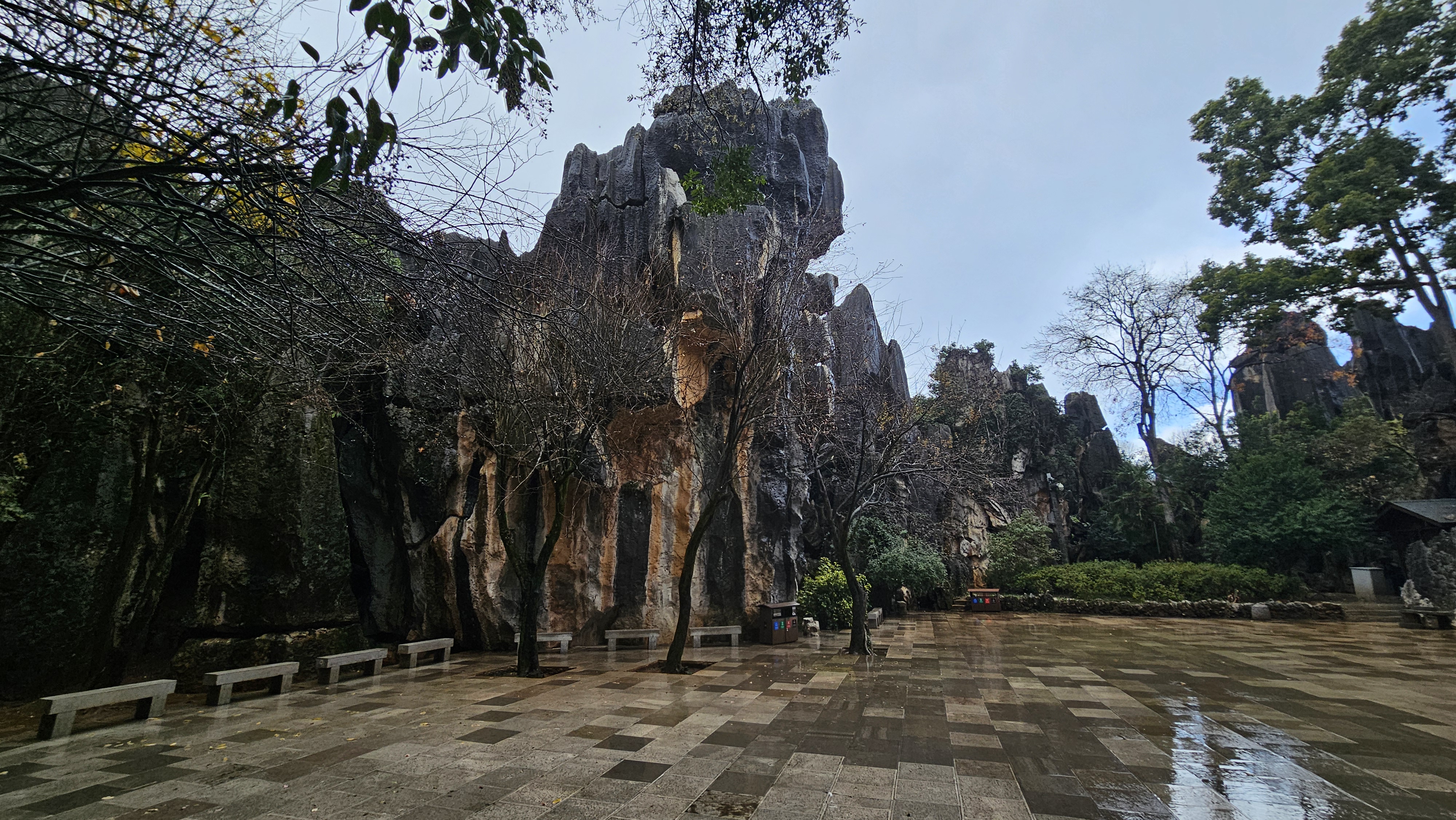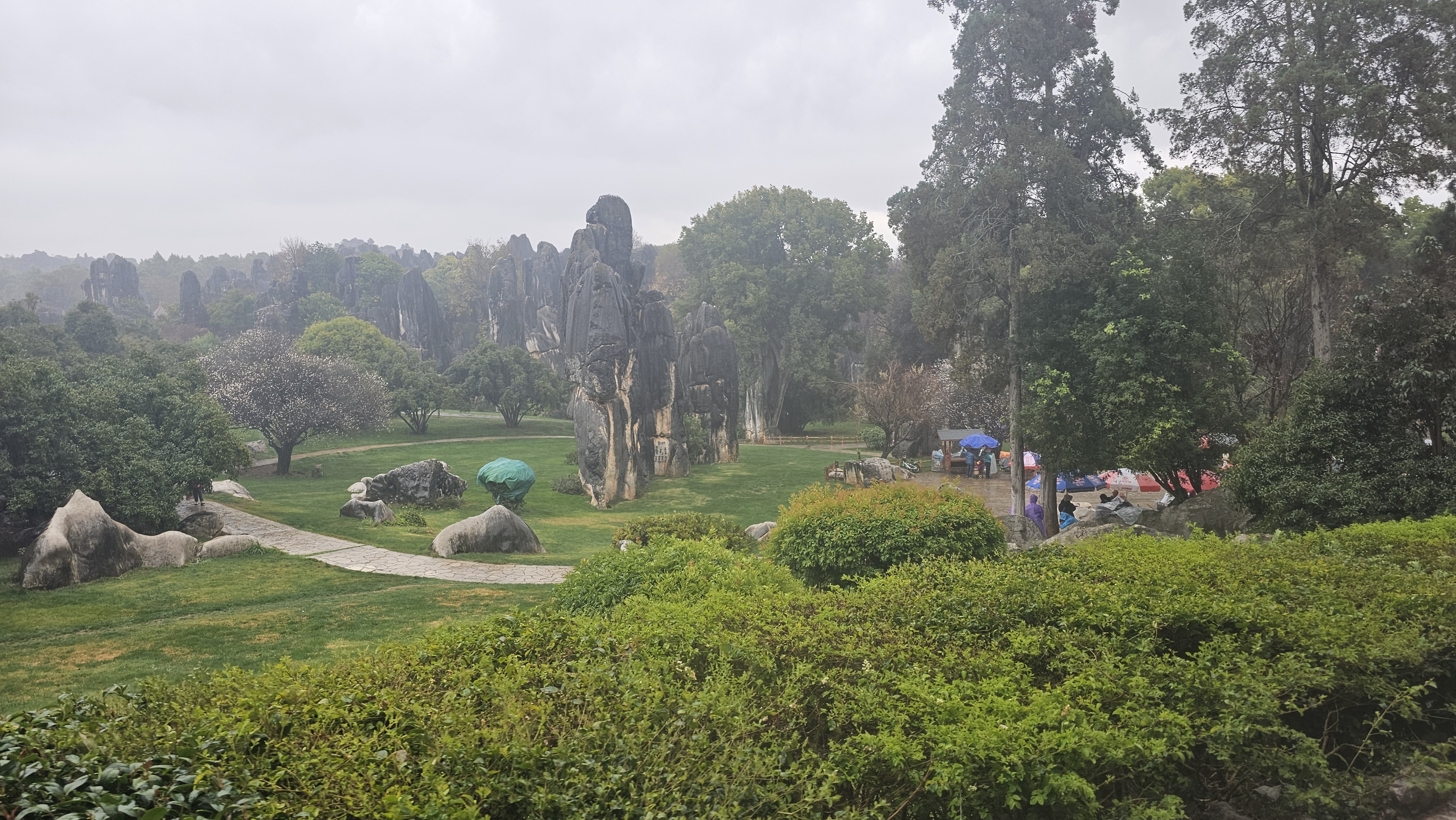 버스로 대략 2시간이 걸렸다. 10시부터 비가 온다더니 출발하자마자 비가 내리기 시작하다가 도심을 벗어나자 또 비가 그쳤다. 하지만 버스에서 내려 관람권을 끊고 전동카를 타고 공원 안으로 들어가니까 비가 쏟아지기 시작하였다. 봄의 도시 곤명답게 1월인데도 초록이 완연하다. 봄색은 비를 만나 더 초록초록이다.